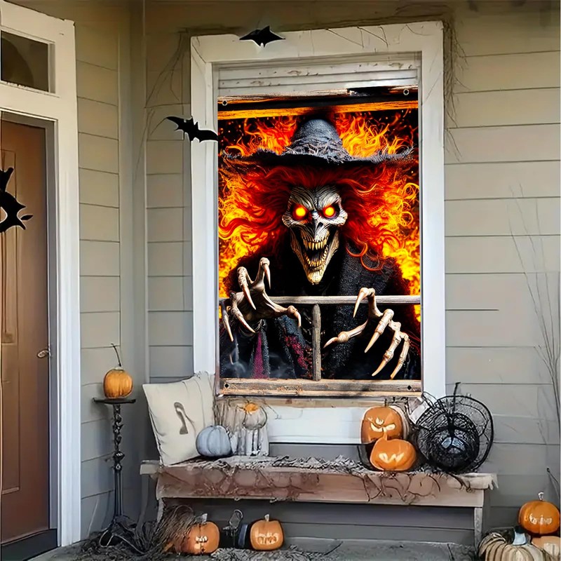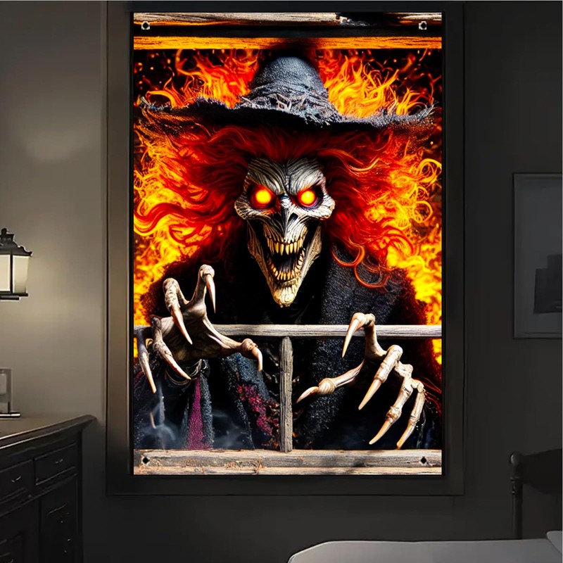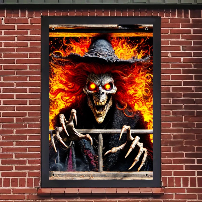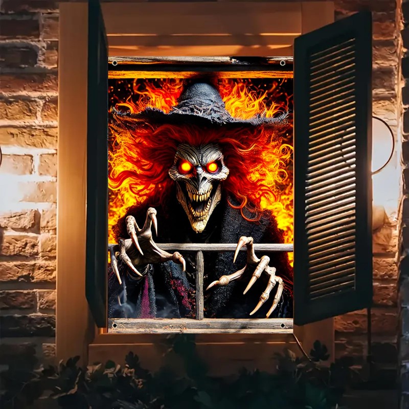 - Fiery-Eyed Skeleton Witch Creates an Eerie Atmosphere: This Halloween window cover features a skeleton witch with glowing fiery eyes peering out menacingly. Her intense gaze heightens the spooky feeling of your haunted house decor. It's a bold visual that grabs attention from both kids and adults. Add chilling excitement to your Halloween display.