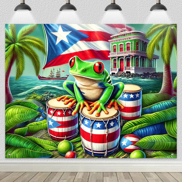 BlissYard Puerto Rico Flag Frog Banner Caribbean Tropical Decor 8x6ft Featuring Puerto Rican Flag Drums Palm Trees Perfect for Outdoor Party Decoration Seasonal Party Decoraaation
