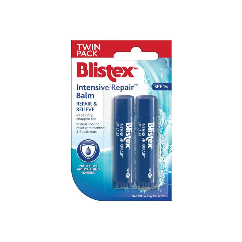 Blistex Intensive Repair Balm repairs dry chapped lips and instantly cools with Menthol & Eucalyptus. Specially formulated to wrap your lips in a protective moisturising barrier to restore hydration and prevent further damage from the elements. SPF 15.