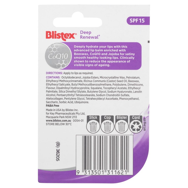 Deeply hydrate your lips with Blistex Deep Renewal, an advanced lip balm enriched with Beeswax, CoQ10 and Jojoba for satiny smooth healthy looking lips. With Advanced Hydration, Deep Renewal is clinically shown to reduce the appearance of visible signs of ageing. SPF 15.