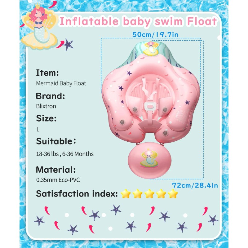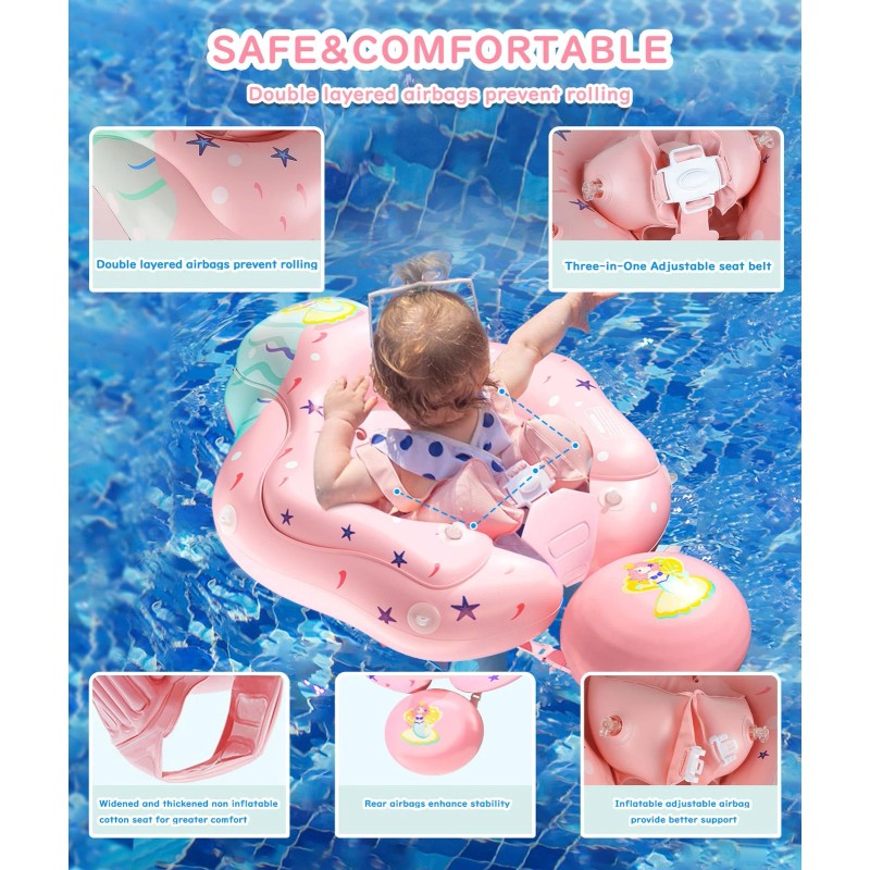 Double layered air chamber design, raised and widened, with two adjustable double layered soft shoulder straps to secure the baby's position, and protective airbags on both sides to support the baby. The swimming ring seat has added non inflatable sponge chest support, extending and widening to protect the baby's abdomen, making it more comfortable for children to use. The improved baby float has a large balance tail ball, which can improve balance, prevent rolling, and enhance safety