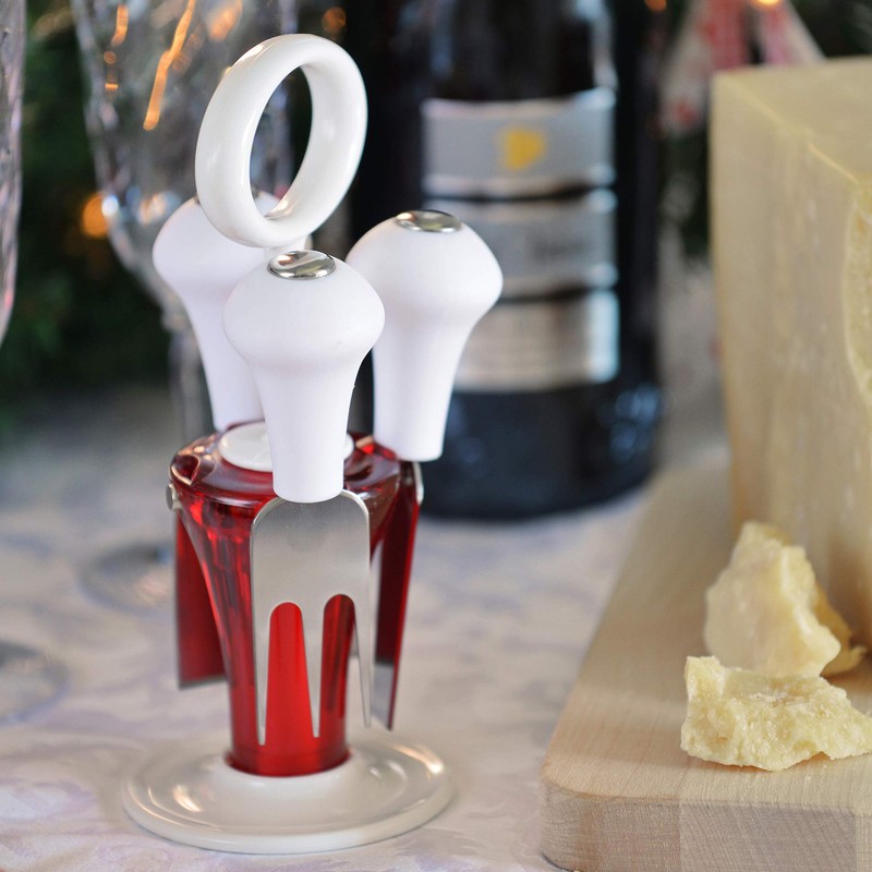 - Contents – This set has been created to include and bring the set of 4 stainless steel knives to the table. They are perfect to cut the soft cheeses and cheeses with a long ripening time. This product has a practical handle that is very ideal for the kitchen and table; it also has couplings with magnets that are perfect for quickly reaching the knives