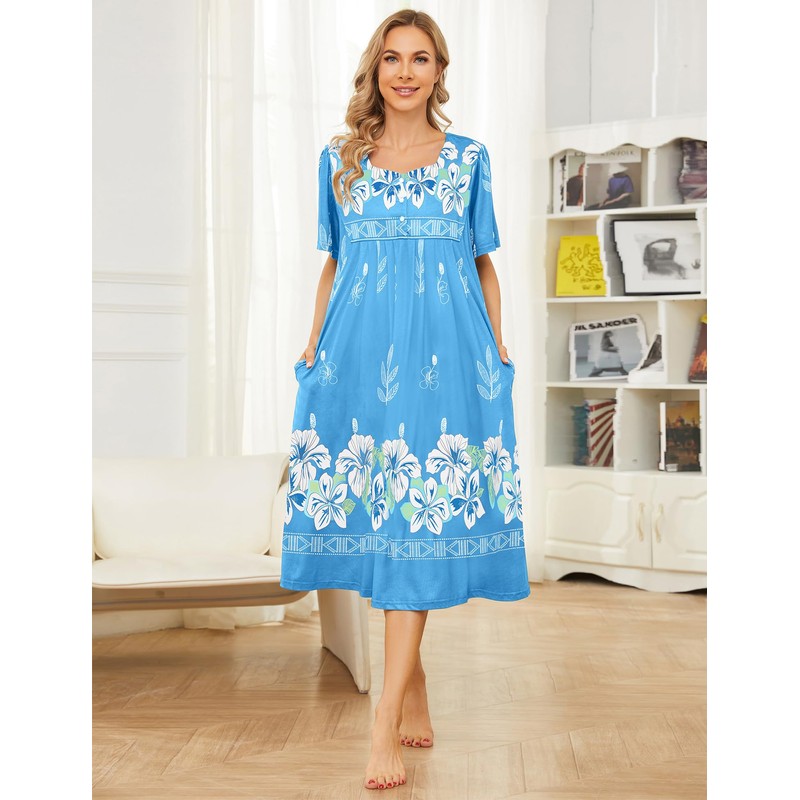 Bloggerlove Nightgown for Women Hawaiian Muumuu House Dress Print Lounger Patio Dress with Pockets Moomoo, Blue, Medium