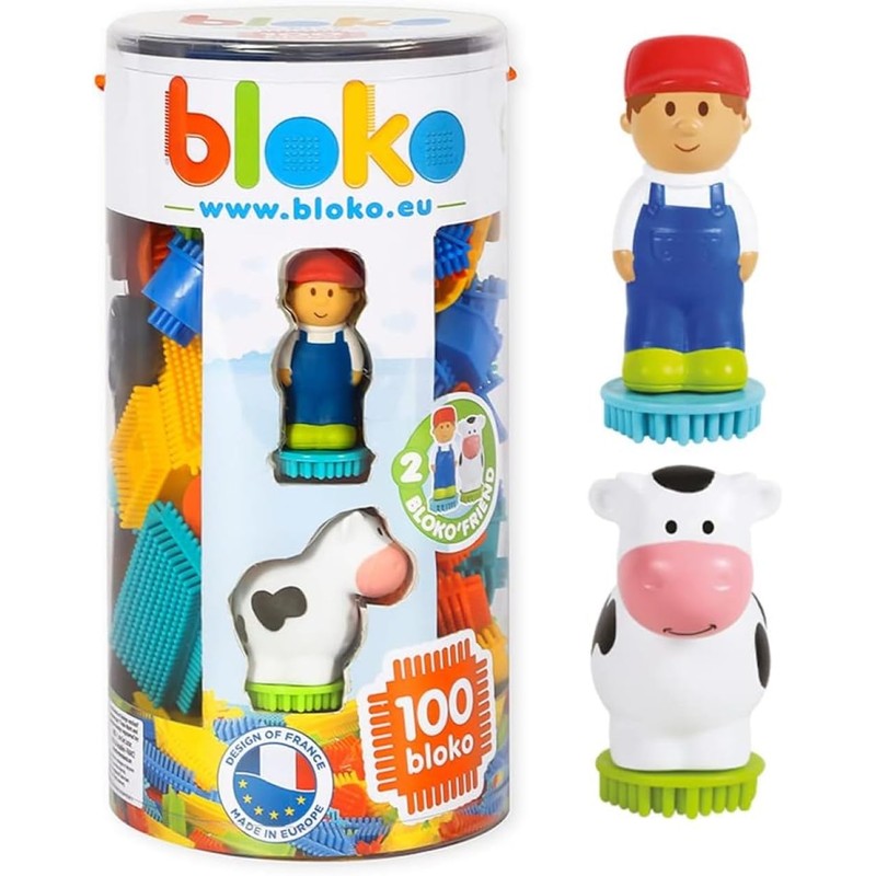 - Tube of 100 BLOKO parts with 2 3D figures on the theme of the farm: Blokofriend Farmer and his cow. Endless building possibilities to awaken their spirit!