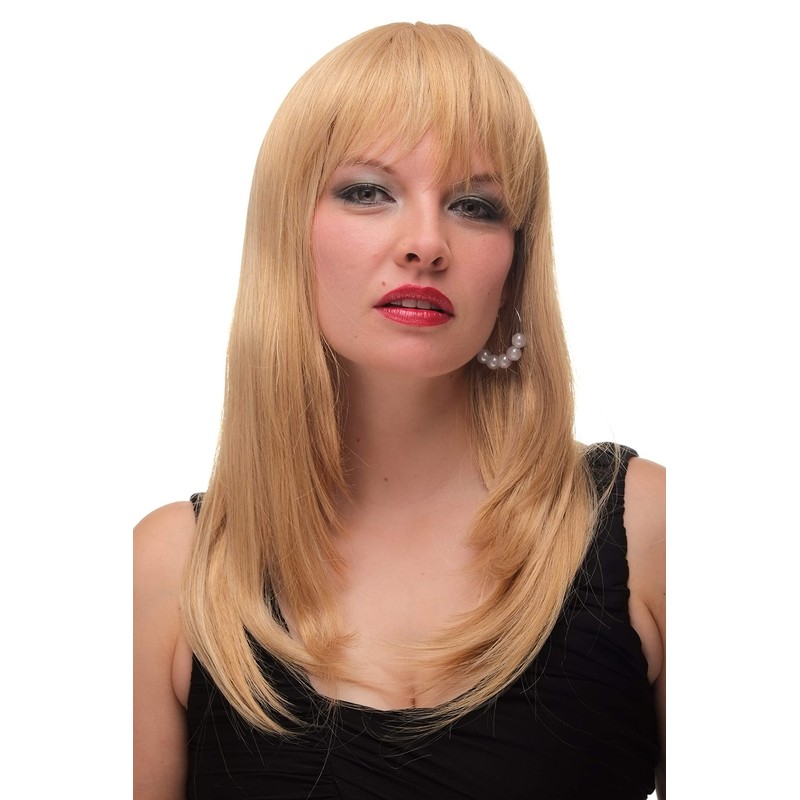 - Blonde wig with straight hair and a chic fringe.