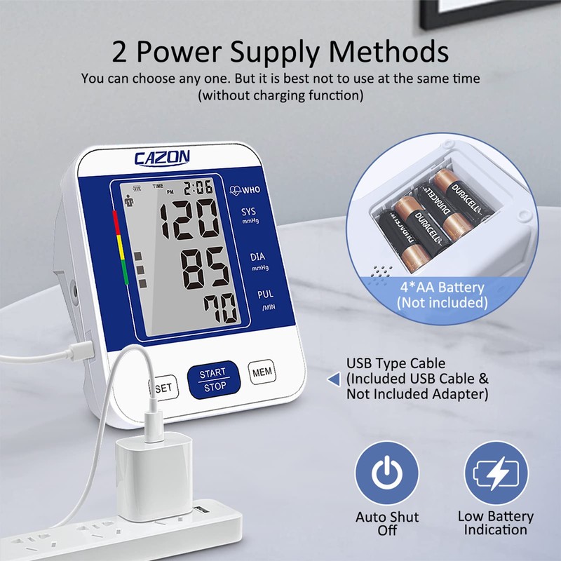 - 【Easy to Use & 2 Power Supply Design】 The blood pressure machine for home use supports One-button operation, just put on the cuff correctly, press the START/STOP button to automatically measure, you can get the answer within 60 seconds. Two power supply methods: Support power on by USB cable(Included) or 4 AA batteries(Not Included). Recommended for home use.