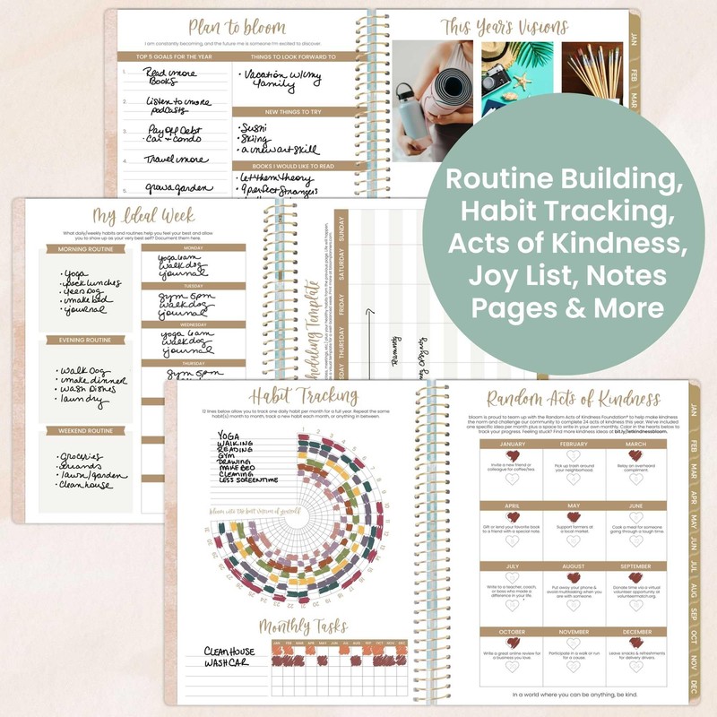Additional pages include: personal info page with a yearly mission statement prompt, yearly overview spreads, values page, joy list, yearly goal setting, vision board, habit tracking, ideal week planning worksheet, weekly scheduling template, monthly spending tracking, notes pages, important dates for next year page, how I bloomed in 2026 page, monthly challenges, inspirational quotes & more!