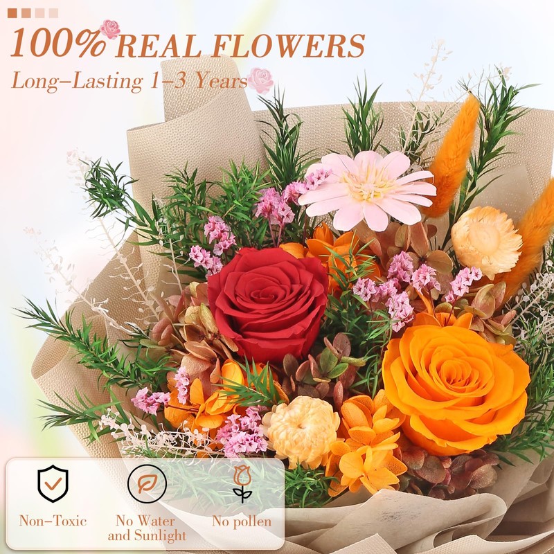 - 【Perfect Gift】The preserved flower bouquet is suitable for many occasions, such as Valentine's Day, Mother's Day, wedding, birthday, anniversary and so on. We've gift wrapped your items!