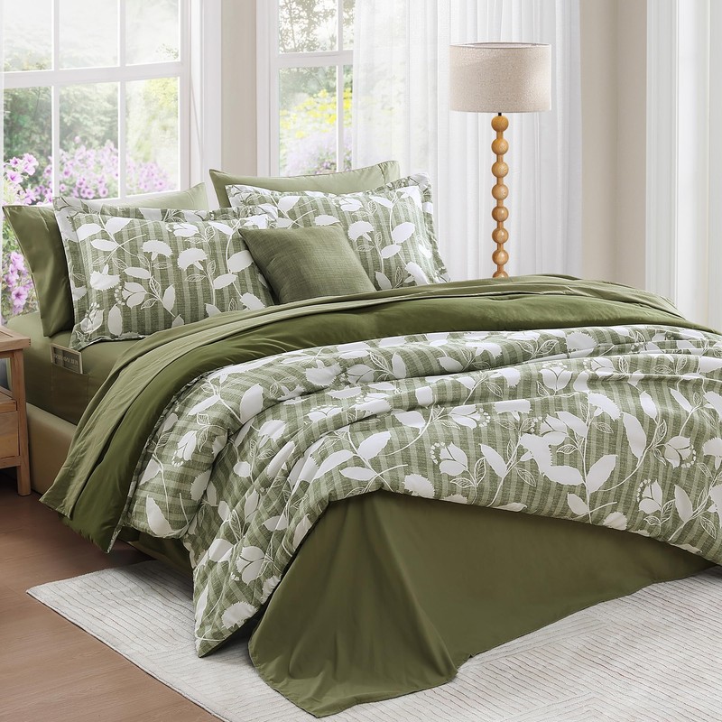 BLOOMHAVEN Queen Comforter Set -7 Pieces Botanical Olive Green Comforter for All Seasons, Bed in a Bag Queen with Flowers Floral Comforter, Sheets, Pillowcases & Shams