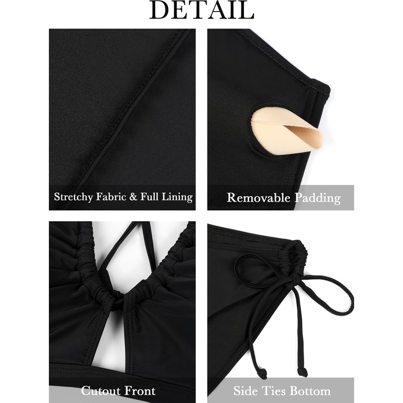 - Stylish Design: The sexy bikini is designed with removable padding, chic front cut-out adds a sexy touch. The tie-back design lets you customize the tightness for comfort and style during any activity. The cheeky bikini bottom with side ties adds a playful touch to the bikini’s look