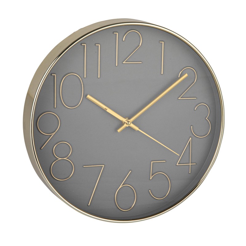 - A striking timepiece, this wall clock features a grey face with gold accents that radiate contemporary elegance
