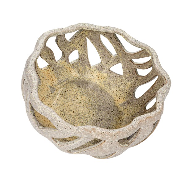 - A round and shallow stoneware bread basket with a reactive glaze that gives it a cream color with speckles and a unique texture