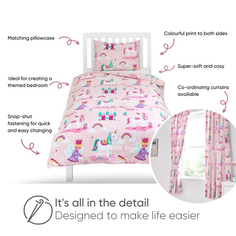 - Magical, fantastic design: transform your children's bedroom into a fairy tale world with our printed "Magic Unicorn" bedding set. The pretty and colourful bedding with fairies, unicorns, rainbow and fairy tale castles promise sweet dreams.