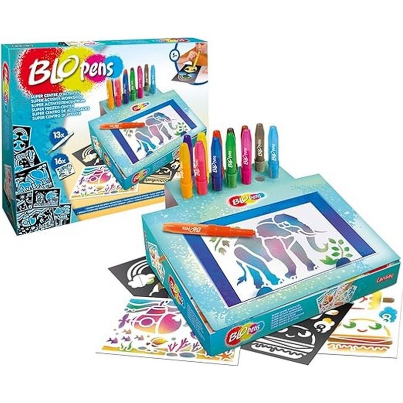 - The set includes: 13 blopens, 16 stencils, 16 sheets of drawing paper, a box with painting desk