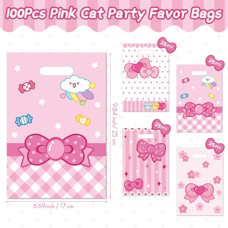 - Package Includes: You will receive 100 pcs of pink cat party favor bags with handle. The cute cat treat bags with 4 exquisite designs, each with 25 pcs. Various styles and sufficient quantities to meet your party gift packaging and sharing needs
