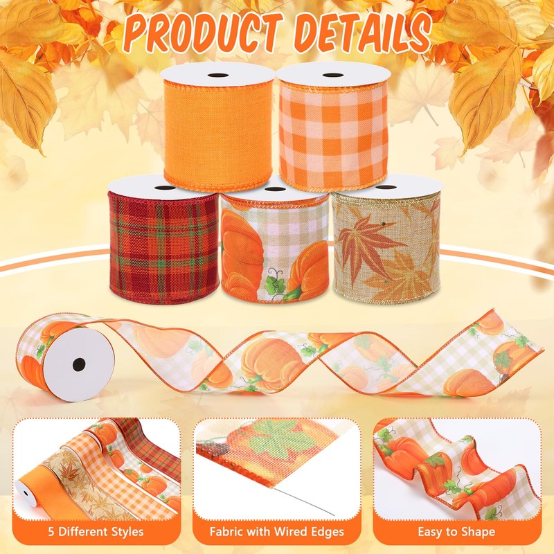 - Package Includes: you will get 5 rolls of fall wired ribbon 2.5 inch, each measures about 6 yards in length, totally 30 yards; The orange fall wired ribbon set comprises 5 designs in various fall colors, can meet autumn harvest ribbon gifts wrap or crafts needs