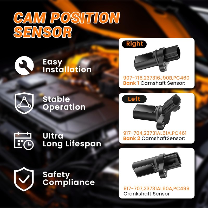 - 🔧 Direct OEM Replacement - [2x Camshaft Position Sensors (Bank 1 & Bank 2) & 1x Crankshaft Position Sensor] Bank 1 Camshaft Sensor: 907-716, 907716, 237315M010, 237315M015, 237315M016, 237316J900, 237316J905, 237316J906, 237316J90B, PC460, PC460T | Bank 2 Camshaft Sensor: 917-704, 917704, 237317Y000, 237317Y001, 23731AL610, 23731AL615, 23731AL616, 23731AL61A, PC461T, PC461 | Crankshaft Sensor: 917-707, 237318J100, 237318J105, 237318J106, 23731AL605, 23731AL606, 23731AL60A, 23731AL60C, 23731WL01A, PC499, PC499T