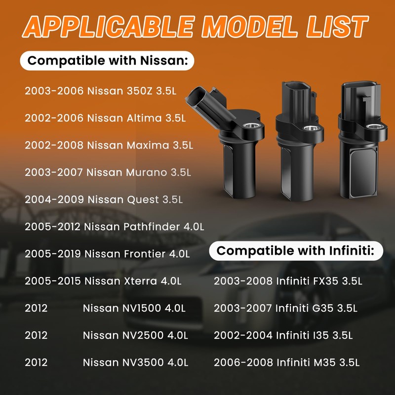 - 🚗 Camshaft & Crankshaft Position Sensor Set Exact Fit for 3.5L V6 Engines -[ Compatible with Nissan: Altima (2002-2006), Maxima (2002-2008), 350Z (2003-2006), Murano (2003-2007), Quest (2004-2006).] & [Compatible with Infiniti: FX35 (2003-2008), G35 (2003-2007), I35 (2002-2004), M35 (2006-2008).] Ensure optimal engine timing and performance with this precision-engineered sensor kit, designed to meet or exceed OEM specifications for Nissan and Infiniti 3.5L V6 vehicles.