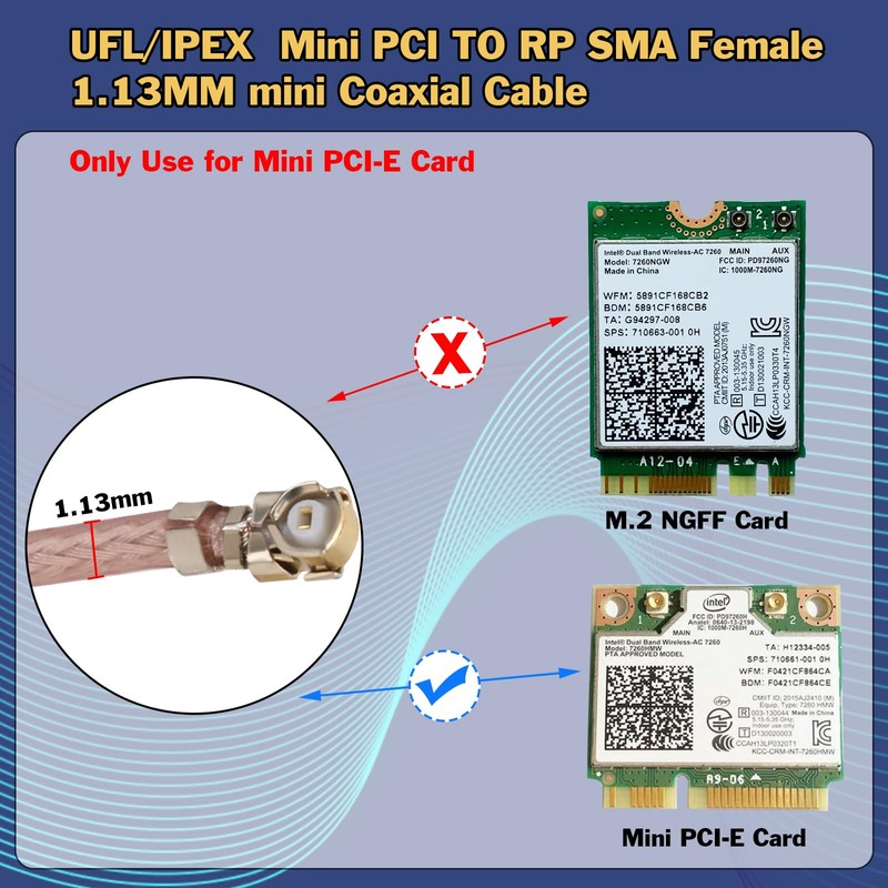 - U.FL IPEX Mini PCI to RP-SMA female bulkhead mount connectors are made of pure copper to ensure durability and recyclability. Notice: This IPEX IPX U.FL pigtail cable is only used for Mini PCI-E interface network cards, and can not fit M.2 NGFF interface network cards, Please check your network cards before purchasing.