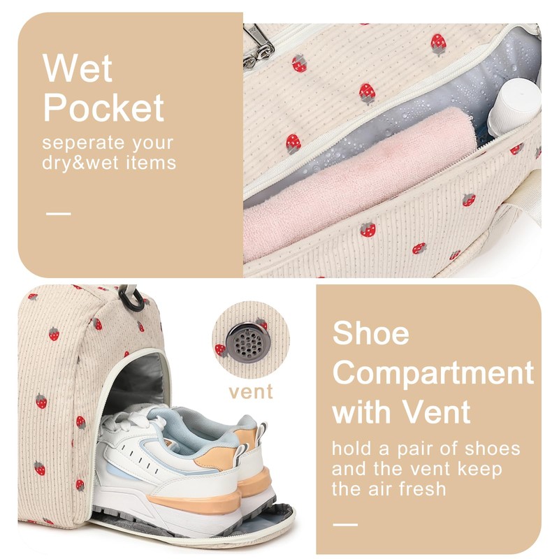 - The spacious main compartment of the cute girl weekend bag can accommodate sports jackets, pants, shirts, hats and thermos cups. The zippered sacks in the main compartment can hold important small items such as cards