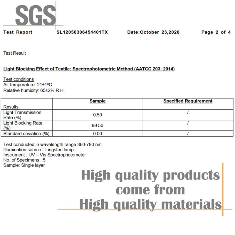 - Premium Triple-Weave Fabric with SGS Certification: 100% Chemical-Free: Physically blocks light by high-density 3-layer weaving—no coatings, no odors. Certified Performance: Blocks up to 99.5% of light and 99.95% of UV rays (darker colors perform better). Durable & Fade-Resistant: Reinforced stitching and UV-protected fibers withstand repeated washing and sunlight exposure.