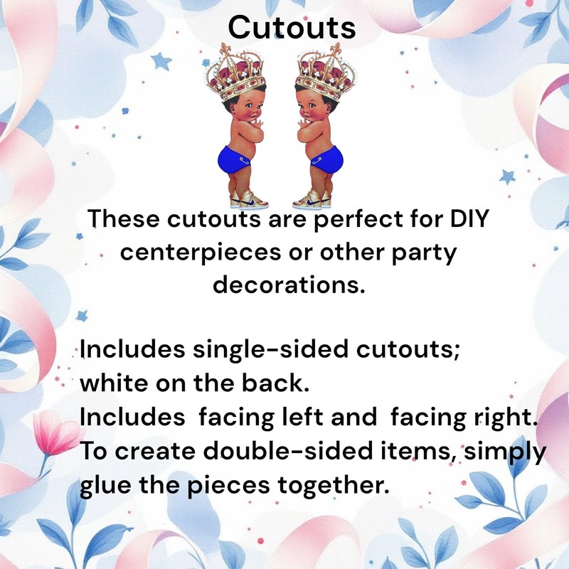 - Royal Prince Theme Design: Celebrate in style with our adorable African American baby boy cutouts featuring a gold and red crown, blue diaper, and regal prince theme — perfect for baby showers or first birthdays.