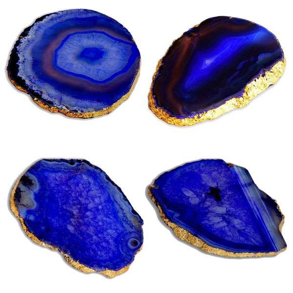 Blue Agate Coasters for Drinks - Set of 4 - Modern Gold Edge Stone Geode Coaster - Agate Slices Random Size 3.5~4" (Gold Edge)