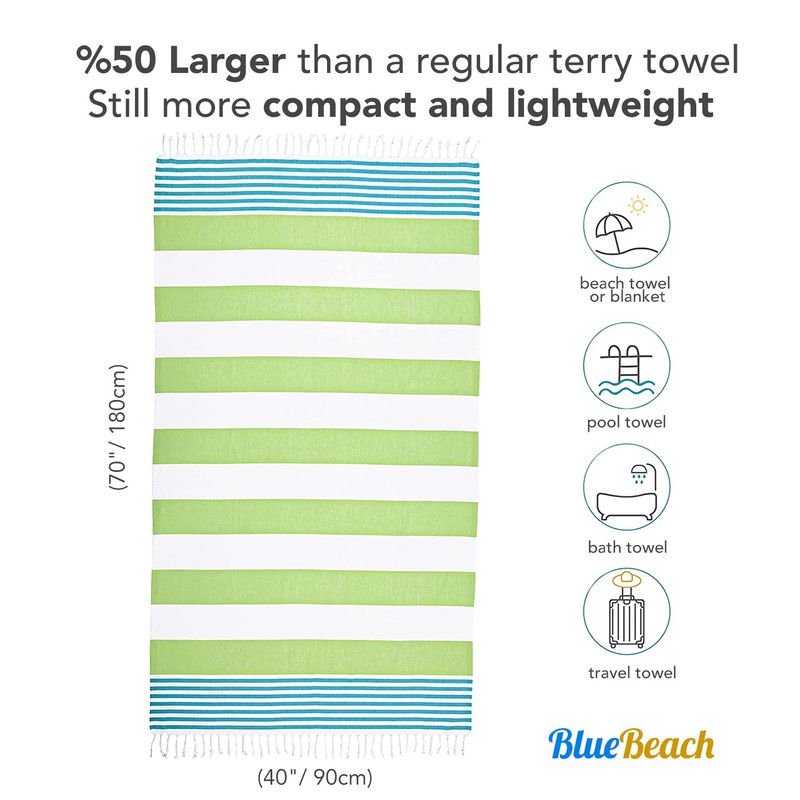 - LARGE & LIGHTWEIGHT - This oversized extra-large Turkish towel ( 70x40"/180x100cm) takes up less space in a bag. Roll up neatly to pack & go. Perfect for hammam, beach, pool, spa, sauna, gym, yoga, travel, camping and picnic. Less storage space, take up about a quarter of the space of a traditional plush towel. Easily stack on small bathroom display shelves or hang on wall-hooks.