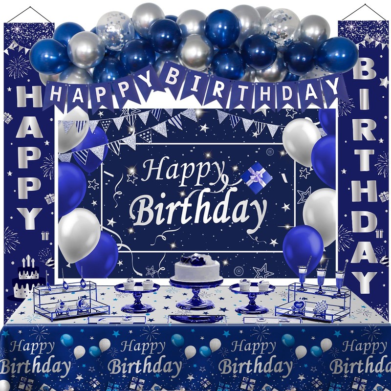 - 【Navy Blue Birthday Decorations Set】Includes 15x10" navy blue balloons, 15x10" silver balloons, 5x12" silver confetti balloons, 1x navy pennant banner garland, 1x navy blue happy birthday backdrop banner, 1x porch sign banners, 1x navy blue tablecloth, plus dot stickers and ribbon. Perfect for happy birthday decorations with a blue and silver party decorations theme. Ideal for creating a happy birthday backdrop or birthday decorations for men/women/boys/kids.