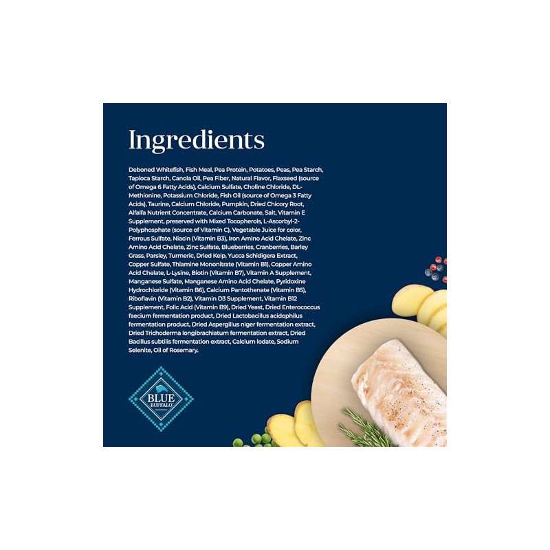 Product DescriptionBLUE Basics Grain Free Dry Cat Food is a limited-ingredient cat food made with real fish as the first ingredient, a high-quality single animal protein source. Formulated to help promote gentle digestion, this natural cat food features pea fiber and pumpkin. This indoor dry cat food also helps promote healthy skin and a shiny coat with Omega 3 and 6 fatty acids. And like all Blue Buffalo cat food recipes, BLUE Basics contains no chicken (or poultry) by-product meals. It's also free of chicken, beef, corn, wheat, dairy, egg, and soy, and is made with no artificial flavors or preservatives.From the ManufacturerBLUE Basics is made with ingredients chosen with great care by our animal nutritionists, providing your adult cat with the right balance of high-quality protein and complex carbohydrates. Plus it's free from the grains and glutens that can trigger allergic reactions in some cats