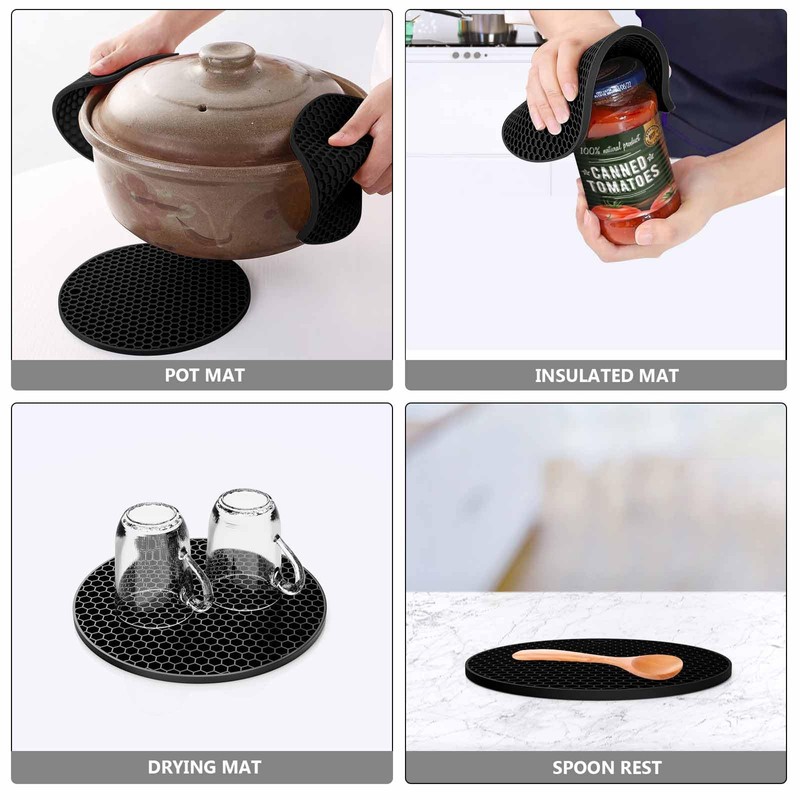 • 【MULTIFUNCTIONAL】This silicone trivet serves as a versatile accessory, functioning not only as a countertop protector but also as a bowl mat, pot mat, coaster, teapot mat, table mat, coffee mat, jar opener, hot pot holder, large coaster, hot mitt, spoon rest, and dish drying mat.
