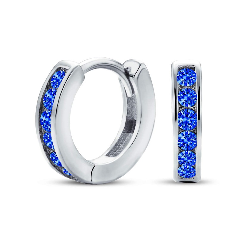 - STUNNING DESIGN - Sleek and chic, September babies will love our 0.5in, rhodium plated silver huggie hoop earrings to enhance any ensemble. Featuring channel set simulated sapphire CZ, these sparkling earrings are a great gift.