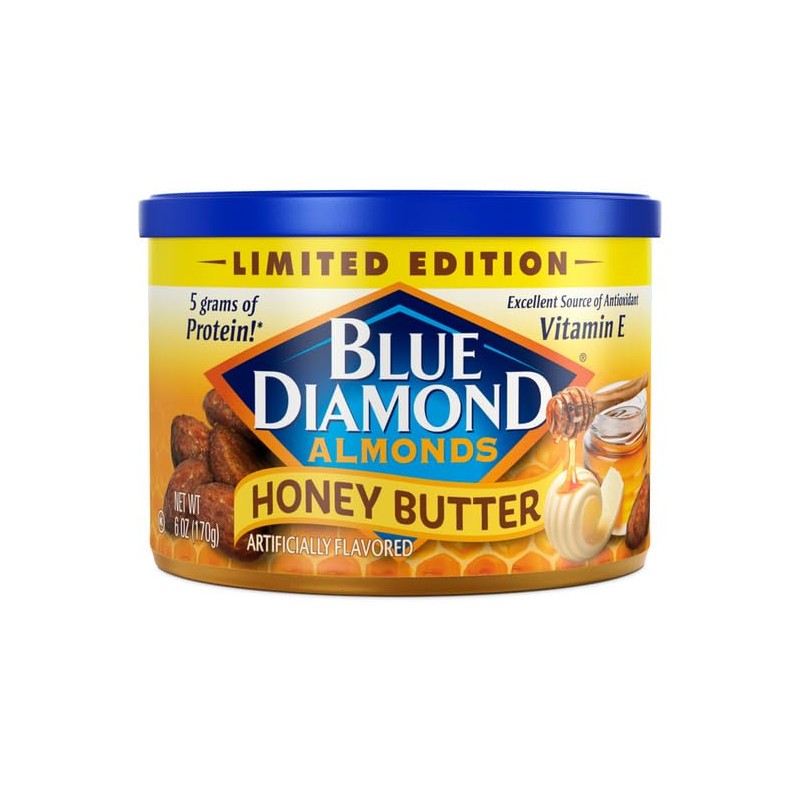 - Contains 1 - 6oz. Resealable Can of Limited Edition Blue Diamond Honey Butter Flavored Snack Almonds