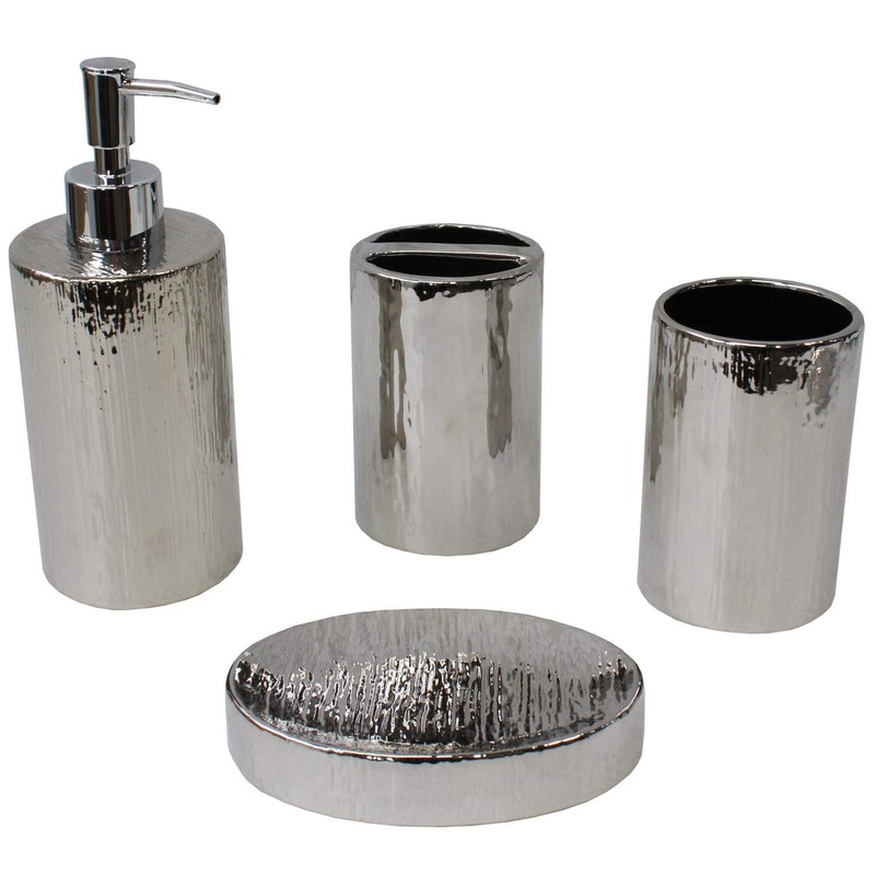 - 4 Piece Ceramic Bathroom Set Includes - 1 tumbler, 1 soap dish, 1 liquid soap dispenser, 1 toothbrush holder