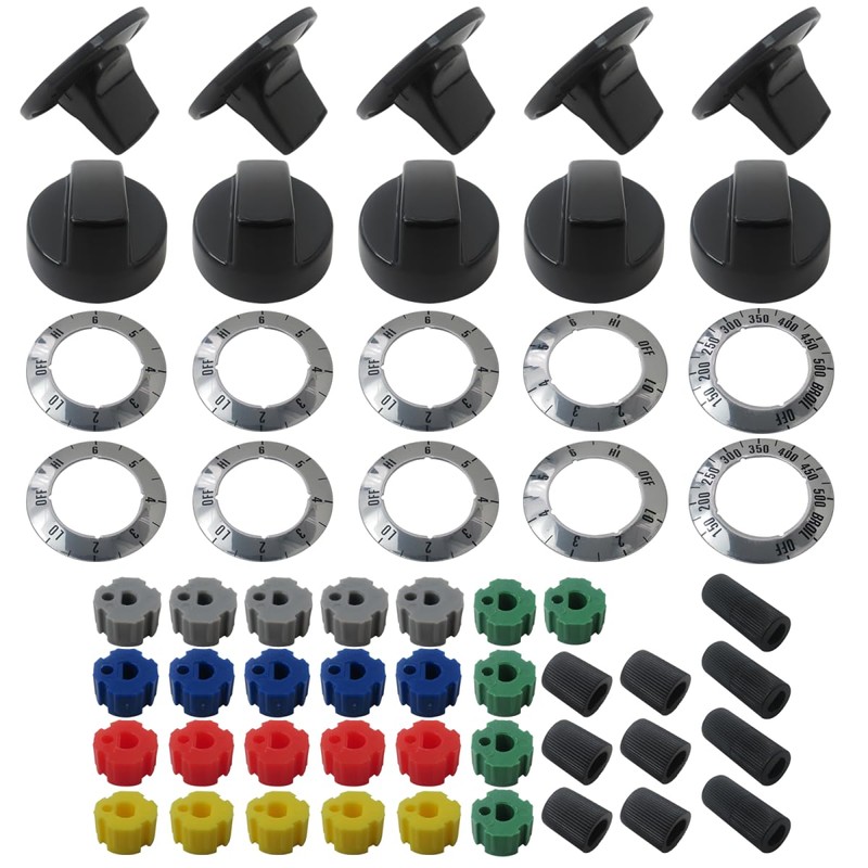 • Please Note: Please double check our pictures and Part Number and description to make sure it is what you need before ordering; PACKAGE INCLUDES: 4 pieces black control knobs with 12 pieces adapters in 2 different styles contain 4 long and 8 short; Electrical knob kit includes 5 pieces KN002 electrical knobs, 4 pieces surface inlays CCW, 4 pieces surface inlays CW, 1 piece thermostat inlay 150 degree - 500 degree w/broil, 1 piece CW to ON inlay and 25 pieces inserts as pictured