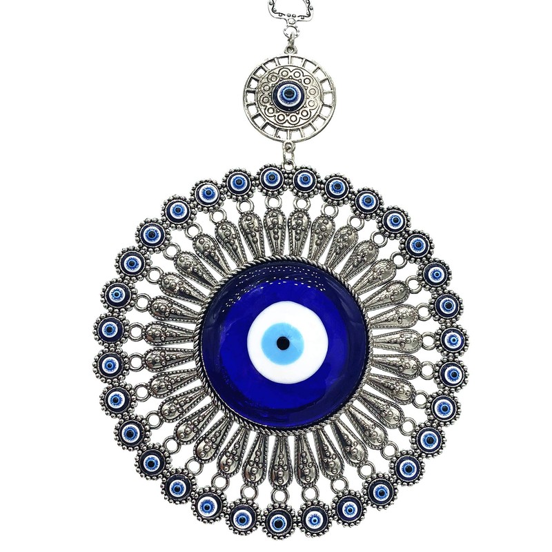 - Detail:material : metal and glass; The diameter of the item is about 6" ; the diameter of the glass Evil eye is 3.5" ; total length is about 9"