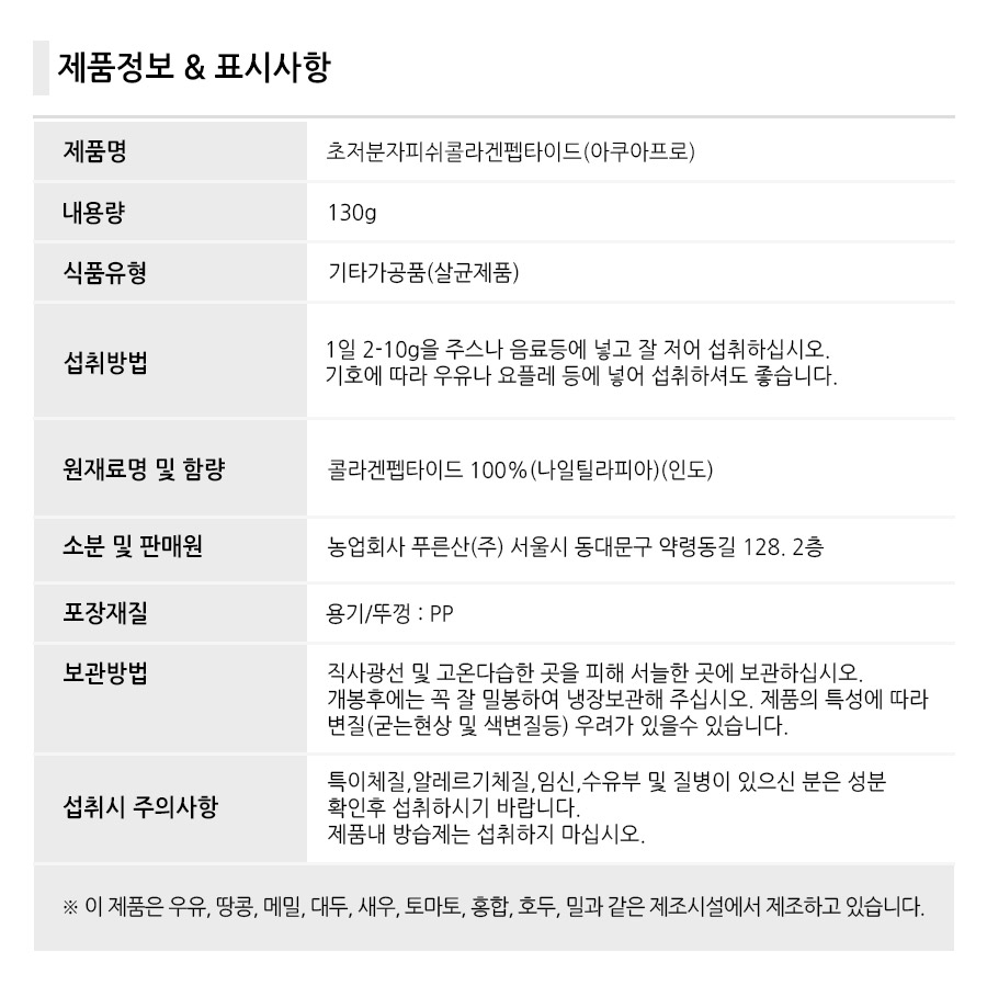 | 원재료 및 함량 | ■생선콜라겐펩타이드(나일틸라피아, 카틀라, 미얀마잉어) 100%(인도) |