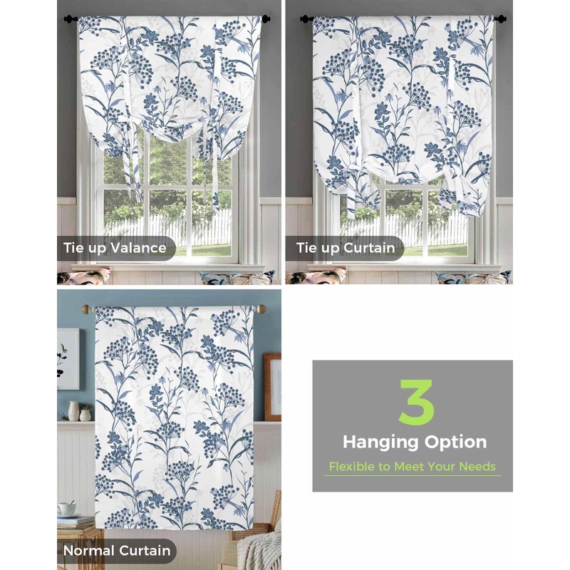 Blue Floral Plant Tie Up Curtains for Kitchen Bedroom Living Room Windows, Adjustable Tie-Up Shade Rod Pocket Curtain Valance Drape Grey Modern Minimalist White Floral Spring Summer 1 Panel, 52" x 45"