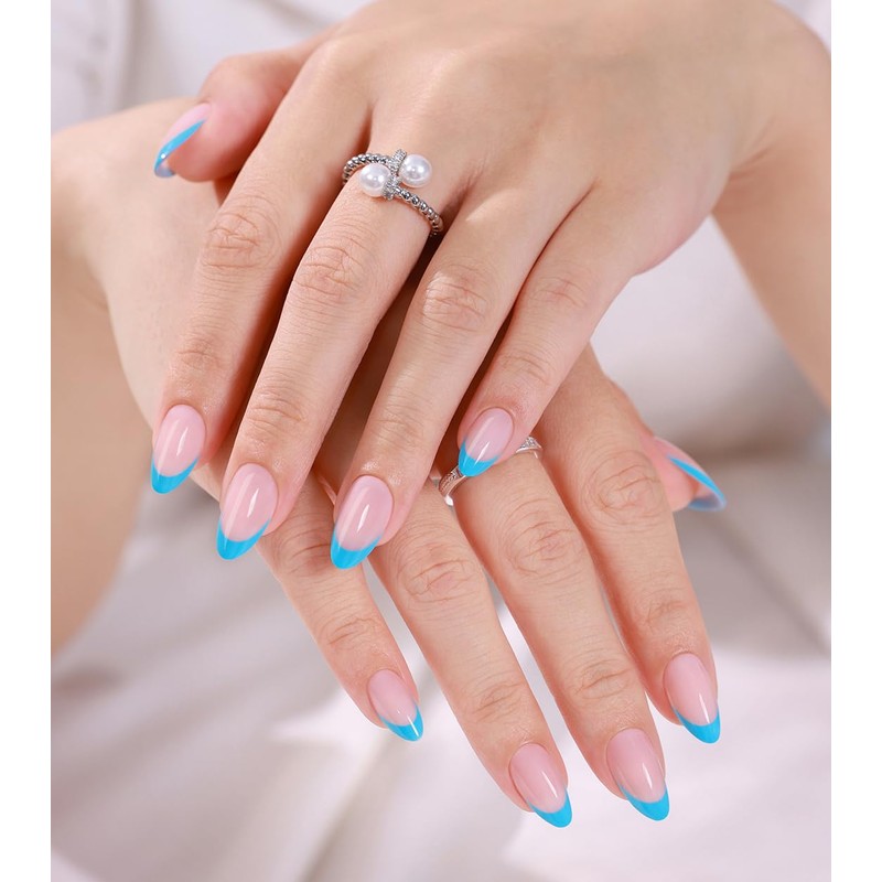 - 【High-Quality PMMA Nails Press Ons】GJZEZ press on nails short almond are made of strong PMMA material. Not easy to chip or fade, and softness is similar to human nails, Providing a more comfortable wearing experience than rough ABS glue on nails. Blue French Tip Nails adds a refreshing touch which can be adapted to various styles, from casual to formal. This design works beautifully in any season, whether paired with summer outfits or winter attire.