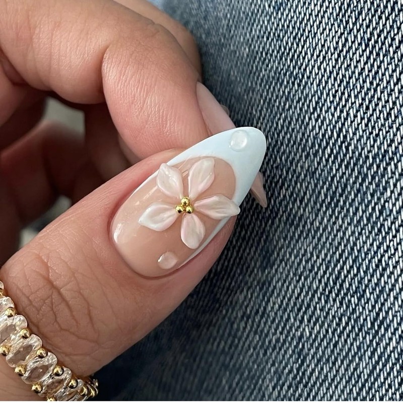 Blue French Tip Press on Nails Medium Almond OFDNE 3D Flower Fake Nails False Nails with Water Drop Pearls Designs Glossy Glue on Nails Stick on Nails for Women Girls 24Pcs