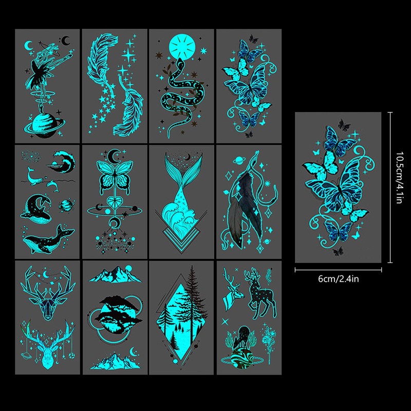 - 🌟 BLUE LUMINOUS TEMPORARY TATTOOS: 12 sheets glow in the dark face body art temporary tattoos, printed with flowers,feather, snakes, deer, butterfly, moon, star and so on. Black or colorful in daylight, but glow blue under UV/black light, sticking on body will make you more unique and exquisite.