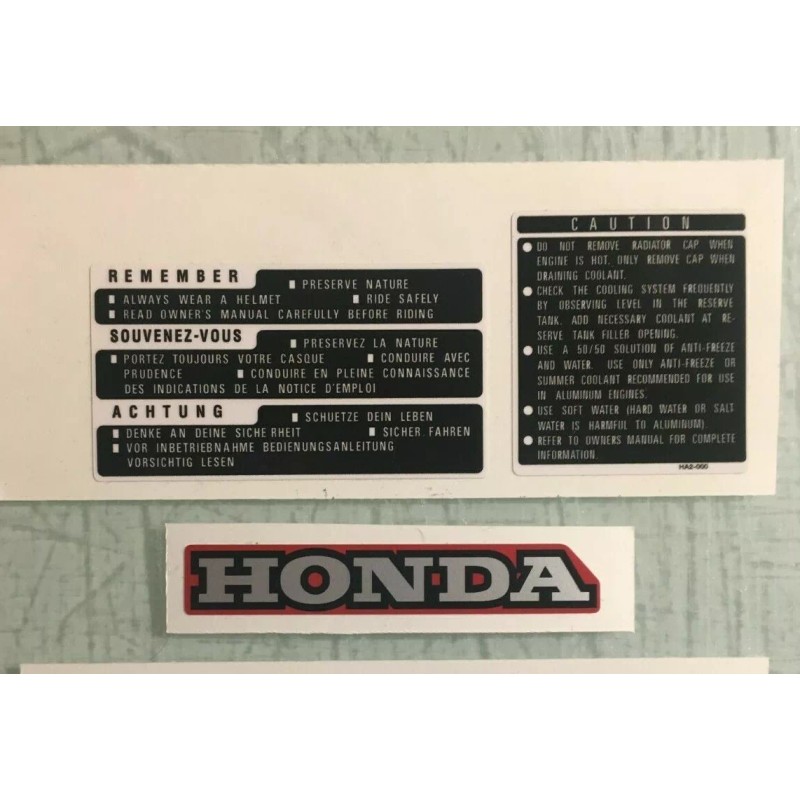 1985 Honda ATC250R headlight decal in factory colors, red, black, & silver and warning decal.