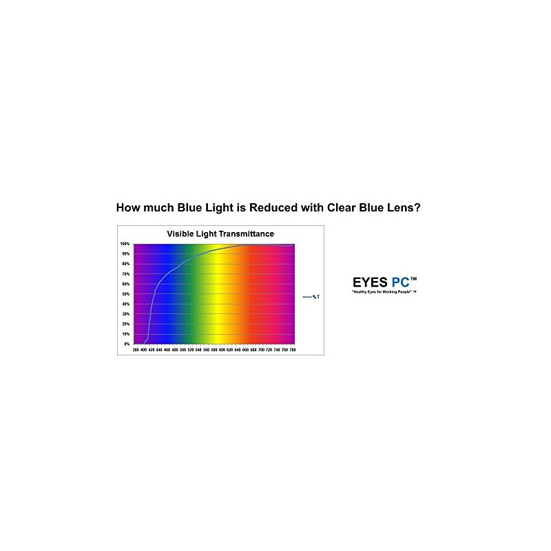 How Much Blue Light Is Reduced: Blue Light Blocking Glasses by Eyes PC remove 100% UV Light and dangerous HEV Blue Light up to 100%, while allowing for the maximum transparency of all colors. An average of 53% Blue Light reduction between 380nm~495nm offers overall protection. You get high definition quality viewing without the dangerous HEV Blue Light in the visible light spectrum. All colors will appear clear when Blue Light scatter has been removed from your viewing. Our Clear Blue lens meet FDA accepted ANSI Z80.3 UV blocking requirements that may come from natural or other sources.