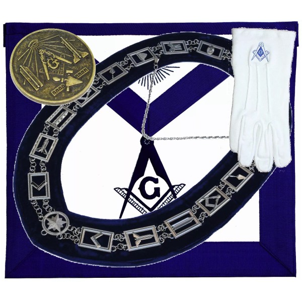 Blue Lodge Chain Collar Master Mason Apron Square Compass + GLOVES +COIN Package