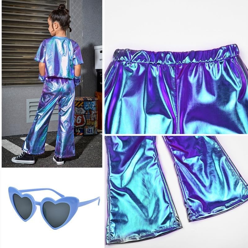 Blue Metallic Pants Girls Sparkly Party Shiny Rave Blue Bell Bottom Sparkly Size 12 13 & Heart Sunglasses