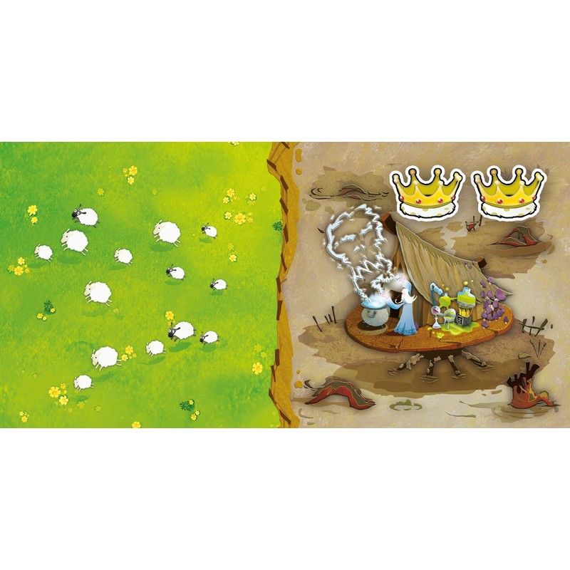Kingdomino uses tiles with two sections, similar to Dominoes. Each turn, each player will select a new domino to connect to their existing kingdom, making sure at least one of its sides connects to a matching terrain type already in play. The order of who picks first depends on which tile was previously chosen, with better tiles forcing players to pick later in the next round. The game ends when each player has completed a 5x5 grid (or failed to do so), and points are counted based on the number of connecting tiles and valuable crown symbols.