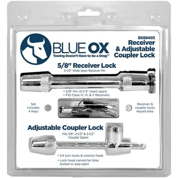 Blue Ox BX88403 Pin Style Coupler Lock & 5/8″ Receiver Lock Kit | Includes 4 Keyed Alike Keys | Fits Class III, IV & V Receivers | Prevents Theft | Dual Purpose for More Security