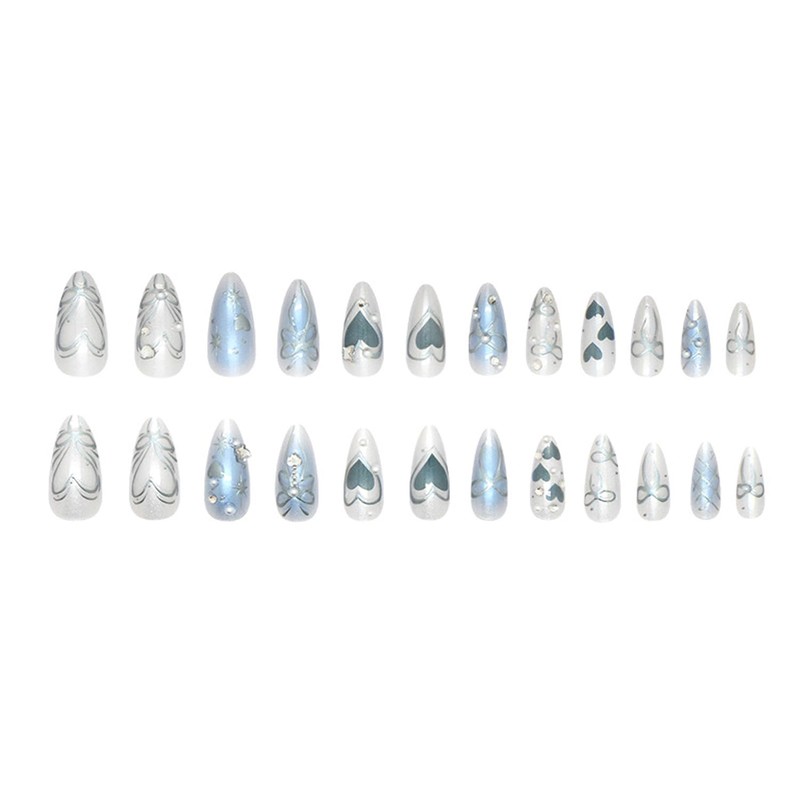 Blue Press on Nails Medium Almond Fake Nails with 3D Diamond Pearl Star Charms Acrylic Nails Press ons Cute Design Heart-shaped Press ons Gradient Bow Silver Star Stick on Nails for Women Daily Wear