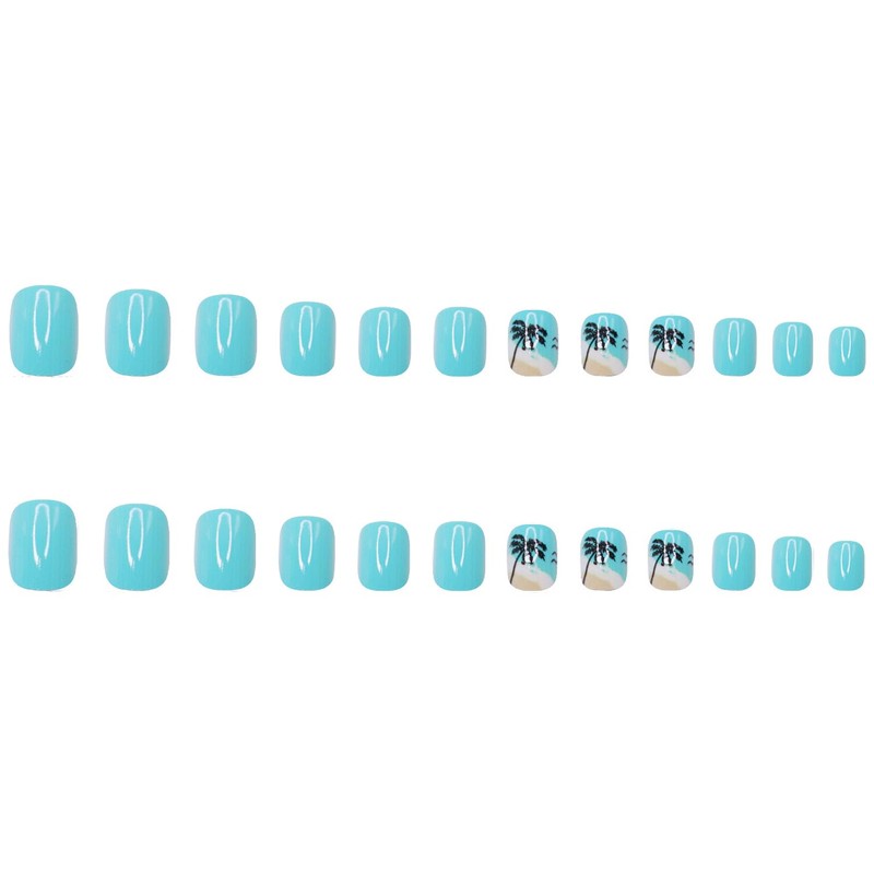 Blue Press on Nails Short Square Beach Nails Fake Nails False Nails with Palm Tree Seagull Designs Beach Nails Glossy Glue on Nails Summer Acrylic Nails for Women Girls 24Pcs