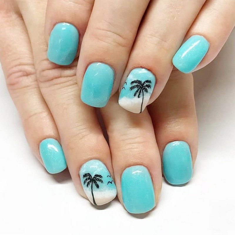 Blue Press on Nails Short Square Beach Nails Fake Nails False Nails with Palm...